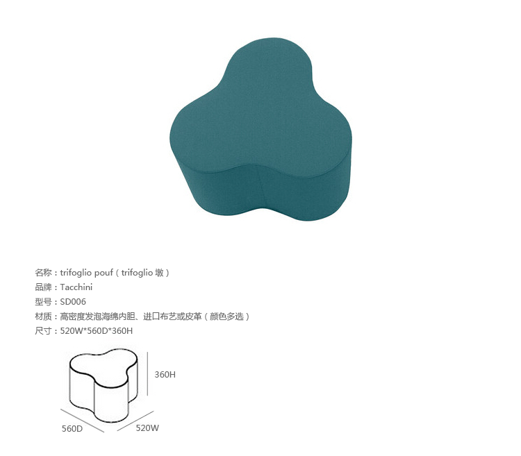 Trifoglio Pouf(trifoglio墩)意大利著名火狐HUOHU(中国)Pietro Arosio的作品。造型就像三叶草叶子,清新自然,并且能根据您的想象力和创造力随意组合。做工精湛,缝线细腻,制作采用防霉实木内框架或玻璃钢内胆、高密度海绵、进口布艺或皮革(颜色可选)。即使不使用,单纯用来欣赏也是赏心悦目的。