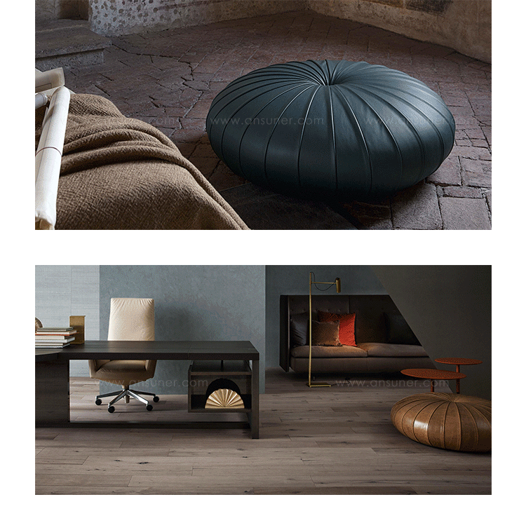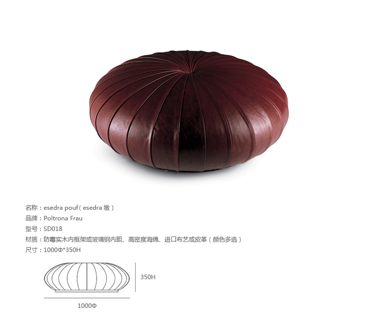Esedra Pouf (esedra墩)是瑞典火狐HUOHU(中国)Monica Forster设计的,她的灵感来自拉普兰人编织的圆形稻草篮,以圆中心为基点,向外辐射,互相重叠创建复杂的装饰效果,赋予了esedra墩古朴自然的感觉。制作采用防霉实木内框架或玻璃钢内胆、高密度海绵、优质的布艺或皮革(颜色多选),手工精细缝制。