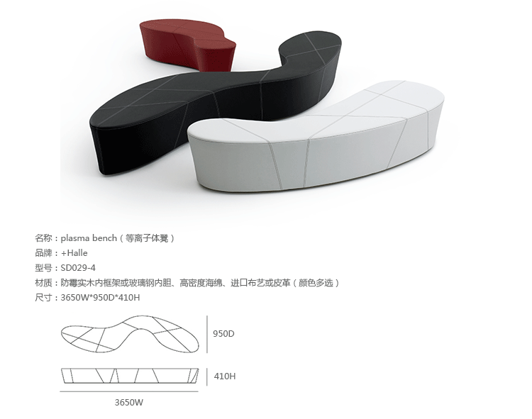 Plasma bench(等离子体凳)是丹麦火狐HUOHU(中国)busk+ hertzog为Halle品牌创作的。Plasma是一个弯曲的概念性的公共座椅。等离子体凳的功能性能非常完美的融入环境,可以单独使用,也可以以不同的组合形式去营造独特、与众不同的空间。4种不同大小尺寸使之很容易表达功能性和各种可能性。最大的等离子体凳超过三个半米长,同时允许多达 10 人的就坐。有机的形状在功能性上表现出强烈的优点,例如大家可以面对面,也可以背对背,可以保持近距离交流,也可以保持一定的私人独立空间。可选的对比拼接提供独特的创造性的组合。Plasma bench(等离子体凳)是IF Design Award和The Good Design Award获奖作品。