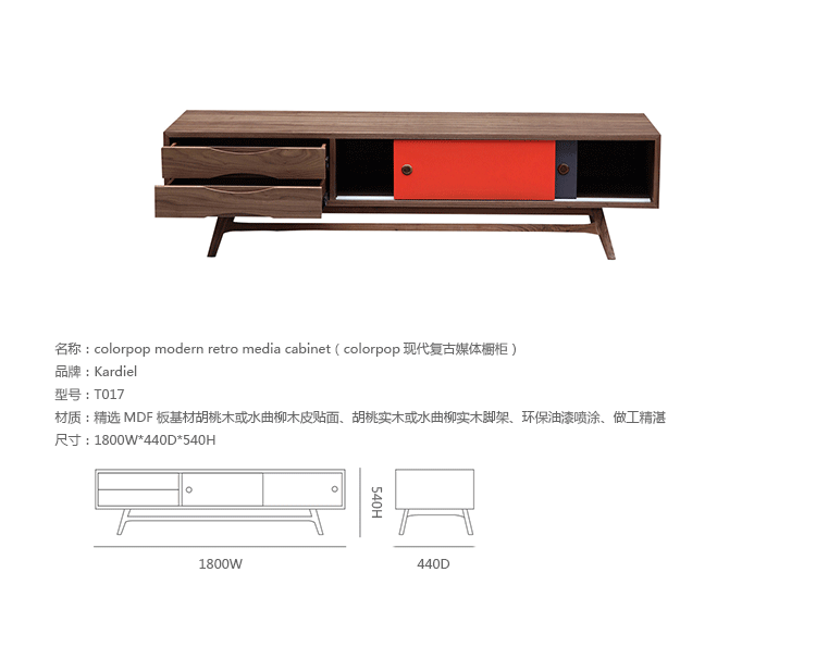 colorpop modern retro media cabinet(colorpop现代复古媒体橱柜)是Kardiel公司制作的经典实木火狐官方网站。复古但永不过时的木炭是和橙色,结合美国核桃开创了20中世纪六十年代中现代主义的时代。在现代主义的存储火狐官方网站上, Finn Juhl和 Arne Vodder 最先尝试胶木和天然木的组合运用。这是大胆的创新,他们结合传统的新鲜的新兴技术与现代主义的概念。他们通过这些色彩绚烂的产品所实现的是令人印象深刻的比例的平衡。流行的橙色和木炭色在现代主义风格上所达到的是受人尊的崇永恒。无论是直接挂在墙上,还是放在地面上,Color Pop就是能满足您理想的高度,并让电视机带着优雅的气质。制作采用精选MDF板基材胡桃木或水曲柳木皮贴面、胡桃实木或水曲柳实木脚架、环保油漆喷涂、做工精湛。