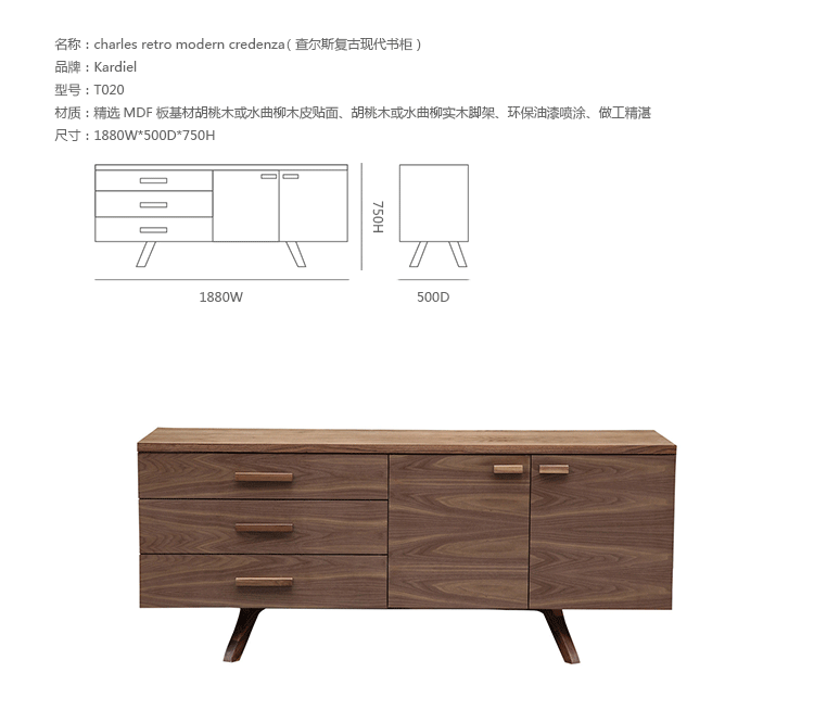 charles retro modern credenza (查尔斯复古现代书柜)是Kardiel公司制作的经典实木火狐官方网站。书柜结合外型、材质和功能性等不同诉求,设计简约质朴。charles retro modern credenza (查尔斯复古现代书柜)提供无论外型或空间都极具特色的储藏功能,创造出您专属的特色储藏系统,亦可作为空间感、通透感十足的隔间柜使用。精选MDF板基材胡桃木或水曲柳木皮贴面、胡桃木或水曲柳实木脚架、环保油漆喷涂、做工精湛。