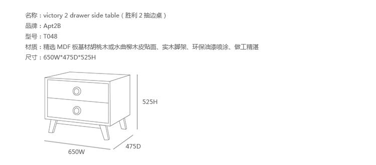 victory 2 drawer side table(胜利2抽边桌)是Apt2B公司设计的经典实木火狐官方网站,设计简单但绝对的华丽,配置2个平滑抽屉,提供许多存储空间,可以存储方便您存储自己的物品,制作采用精选MDF板基材胡桃木或水曲柳木皮贴面、实木脚架、环保油漆喷涂、做工精湛。