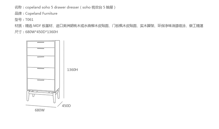 copeland soho 5 drawer dresser(科普兰soho 5抽梳妆台)是Copeland Furniture公司copeland实木系列之一。我们塑造环境,然后环境塑造我们,copeland旨在传递的舒适度和清晰度的感情。设计借用了一些最优秀的传统和当代的设计要素,非常具有特色。这个中世纪现代风格的设计,提供了5层平滑抽屉存储空间,可以使您更好的归纳自己的物品,提供大量存储空间。制作采用精选MDF板基材、进口美洲胡桃木,贴面、实木脚架、彩色装饰边、环保净味油漆喷涂、做工精湛。