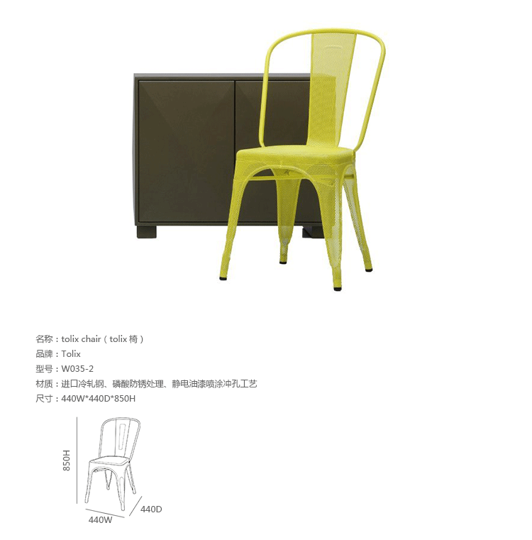 tolix chair(tolix椅)一把有味道、有态度的椅子,据说它最开始被使用在一艘战舰的天气预报房间里,故事的真实性与否不得而知,但是不影响其成为享誉世界的著名设计火狐官方网站,1934年由Xavier Pauchard设计,早期是作为户外用火狐官方网站设计,力图展现法式慵懒而闲适的气质,经年而来被全世界时尚火狐HUOHU(中国)所宠爱,从室外扩展到家居、商业、展示等多个用途,而此椅也不负众望在各类空间中均有上佳表现,特别是近年来与混搭、乡村、美式、怀旧、北欧简约、中式等主要装修风格搭配,都呈现出独特的韵味,也被时尚界赞为“百搭第一”椅,可以用在酒吧,餐馆,咖啡馆等等地方,之后通过改进,设计出有扶手版本的tolix armchair(tolix扶手椅),高背版本的tolix high back bar stool(tolix高背吧凳),宽背版本的tolix wide back bar stool(tolix宽背吧凳),及tolix bar stool(tolix吧凳)和tolix mini stool(tolix迷你凳)。制作采用进口冷轧钢、磷酸防锈处理、静电油漆喷涂工艺、坐面为木板或PU海绵坐垫,颜色可选。