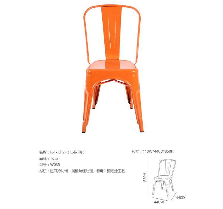 tolix chair(tolix椅)一把有味道、有态度的椅子,据说它最开始被使用在一艘战舰的天气预报房间里,故事的真实性与否不得而知,但是不影响其成为享誉世界的著名设计火狐官方网站,1934年由Xavier Pauchard设计,早期是作为户外用火狐官方网站设计,力图展现法式慵懒而闲适的气质,经年而来被全世界时尚火狐HUOHU(中国)所宠爱,从室外扩展到家居、商业、展示等多个用途,而此椅也不负众望在各类空间中均有上佳表现,特别是近年来与混搭、乡村、美式、怀旧、北欧简约、中式等主要装修风格搭配,都呈现出独特的韵味,也被时尚界赞为“百搭第一”椅,可以用在酒吧,餐馆,咖啡馆等等地方,之后通过改进,设计出有扶手版本的tolix armchair(tolix扶手椅),高背版本的tolix high back bar stool(tolix高背吧凳),宽背版本的tolix wide back bar stool(tolix宽背吧凳),及tolix bar stool(tolix吧凳)和tolix mini stool(tolix迷你凳)。制作采用进口冷轧钢、磷酸防锈处理、静电油漆喷涂工艺、坐面为木板或PU海绵坐垫,颜色可选。