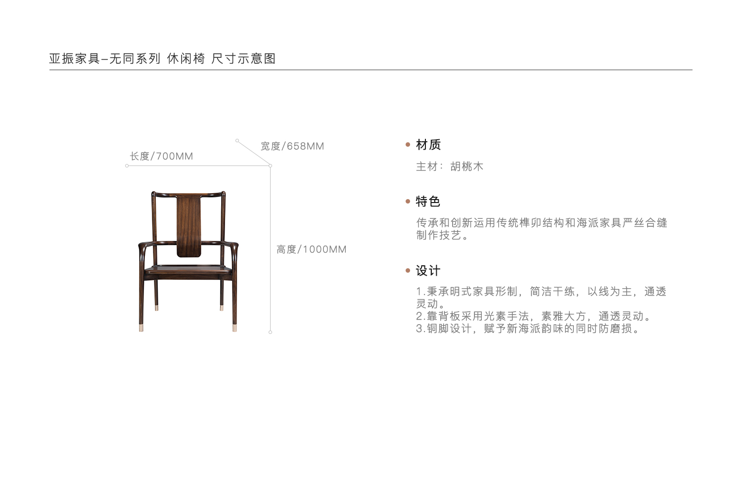 1.秉承明式火狐官方网站形制,简洁干练,以线为主,通透灵动。 2.靠背板采用光素手法,素雅大方,通透灵动。 3.铜脚设计,赋予新海派韵味的同时防磨损。