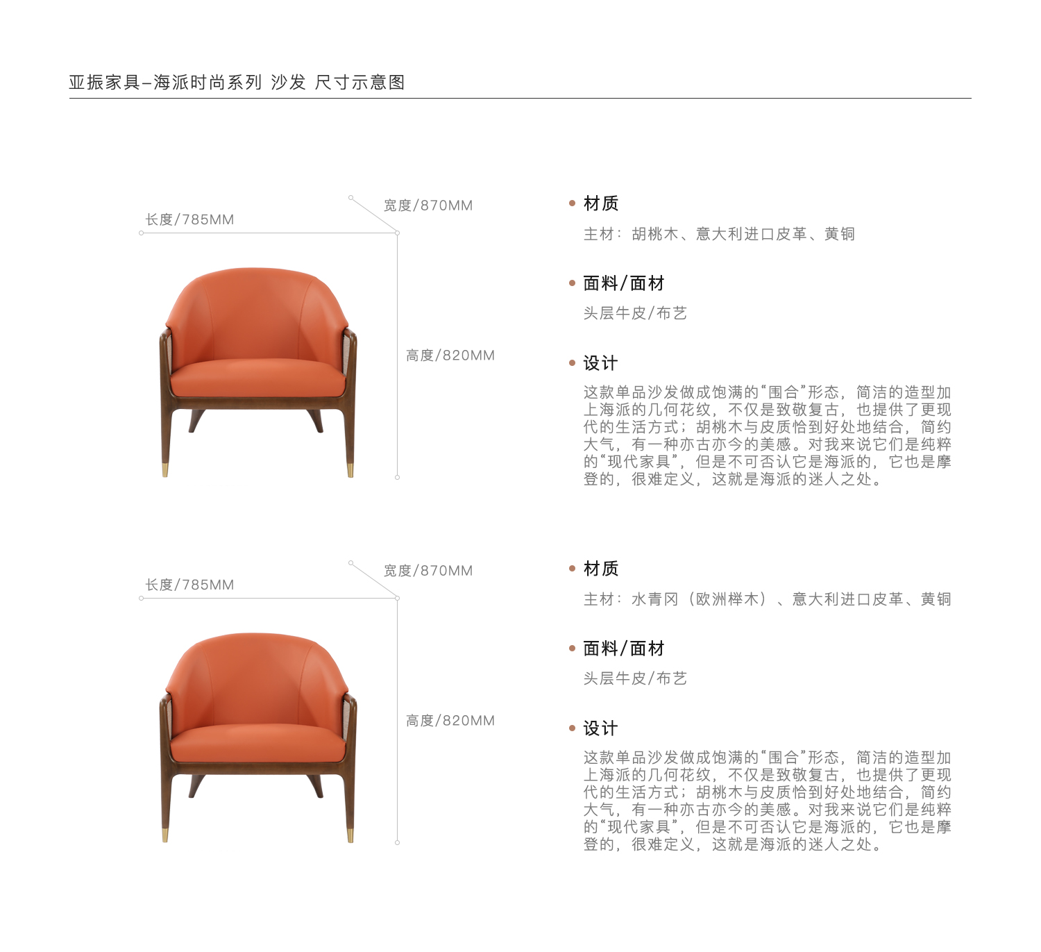 这款单品沙发做成饱满的“围合”形态,简洁的造型加上海派的几何花纹,不仅是致敬复古,也提供了更现代的生活方式;胡桃木与皮质恰到好处地结合,简约大气,有一种亦古亦今的美感。对我来说它们是纯粹的“现代火狐官方网站”,但是不可否认它是海派的,它也是摩登的,很难定义,这就是海派的迷人之处。