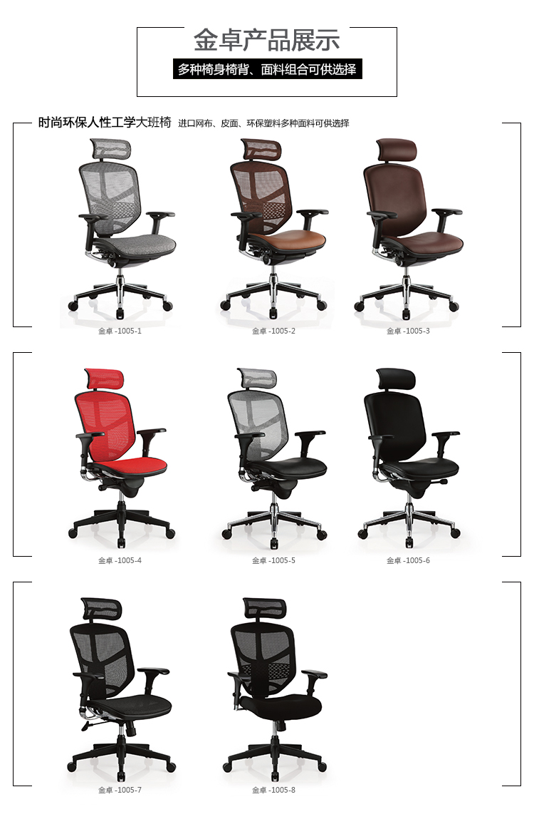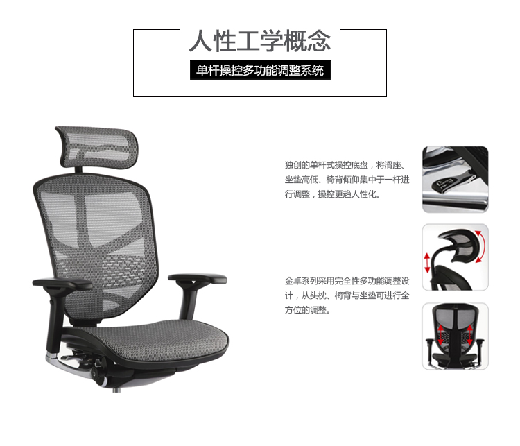 金卓系列采用完全性多功能调整设计,从头枕、椅背与座垫可进行全方位的调整;