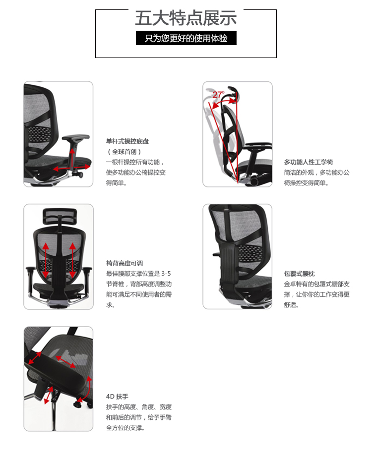 全球首创的单杆式操控底盘,一根杆操控所有功能,使办公椅的操控更加人性化;