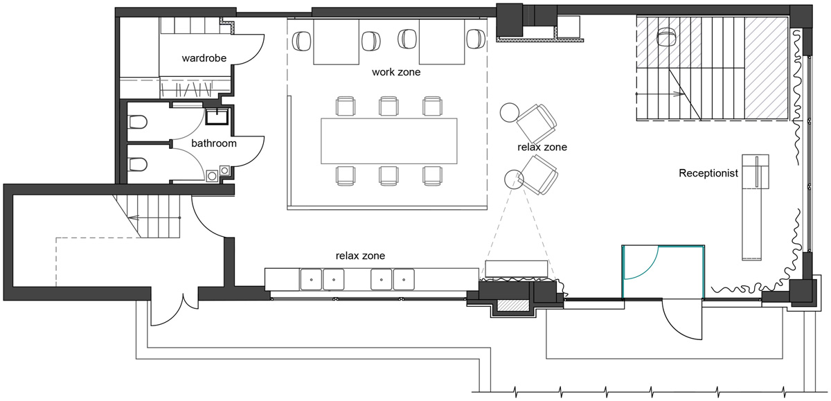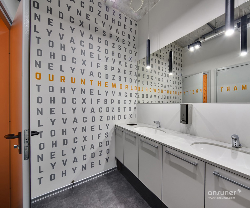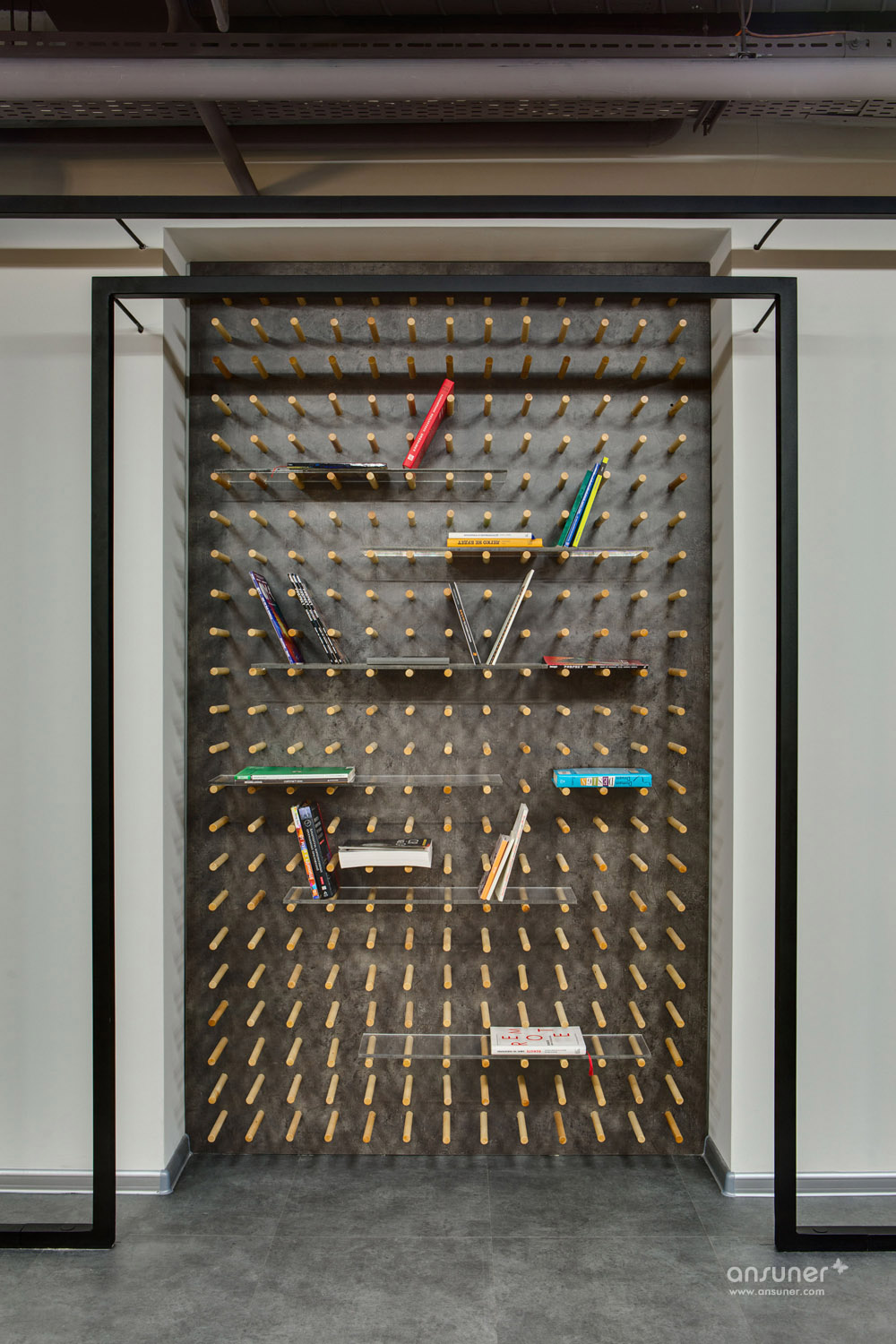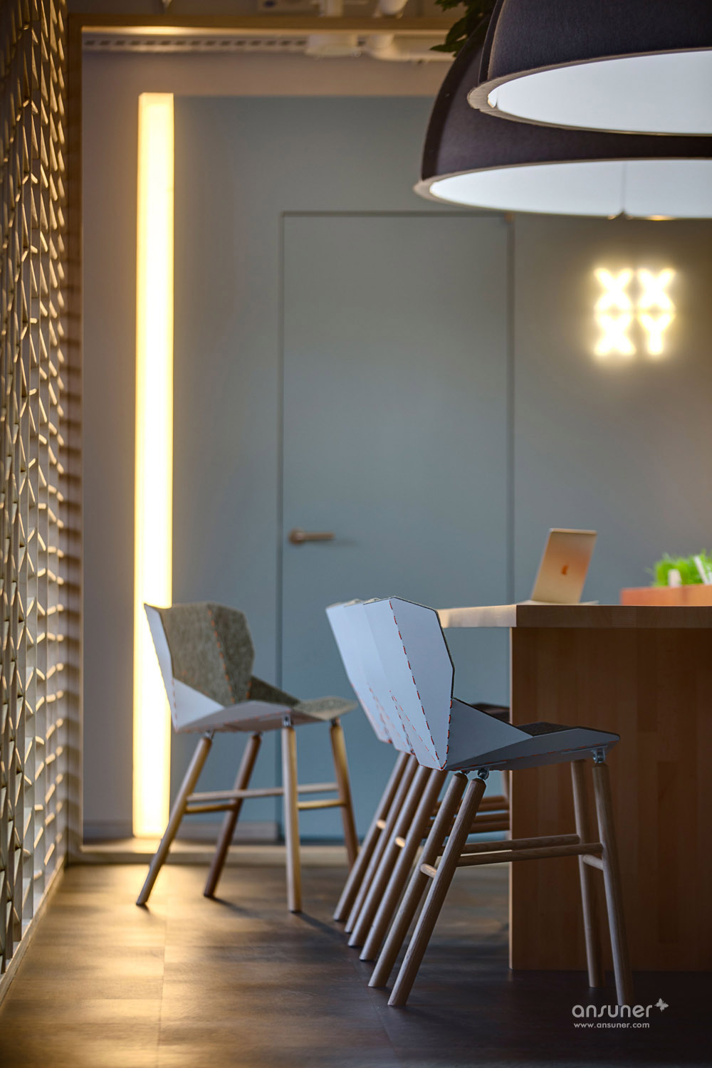 三层主要用作联合办公空间,配有会议室、skype视频聊天室、以及几间专题会议室。这里还配以开放而流动的新闻中心、以及采用接待区的格调布局的商务洽谈区。在这个洋溢着极简工业美学的工作空间里,设计团队运用了大量的创意吸引创业者,如鲜明饱和的色彩点缀、大量的创意图形与文字设计等。