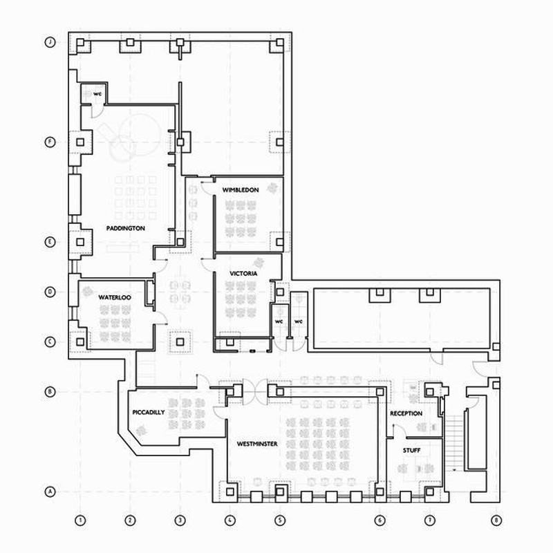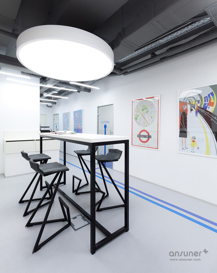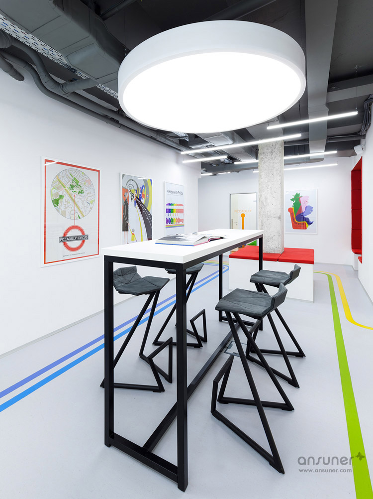 如彩虹般缤纷绚丽的地面彩色线条设计,受到伦敦地铁的灵感启发,不仅具有空间的导向作用,还成为本案的设计亮点。地面上的每一道彩虹线条都标有地铁站的名称,将人们从接待区导引至演讲大厅、主题海报、古色古香的“出口”指示牌、以及如同地铁车厢的红色盒子和其它一些细节设计,令人们时刻感受身处伦敦地铁的氛围。