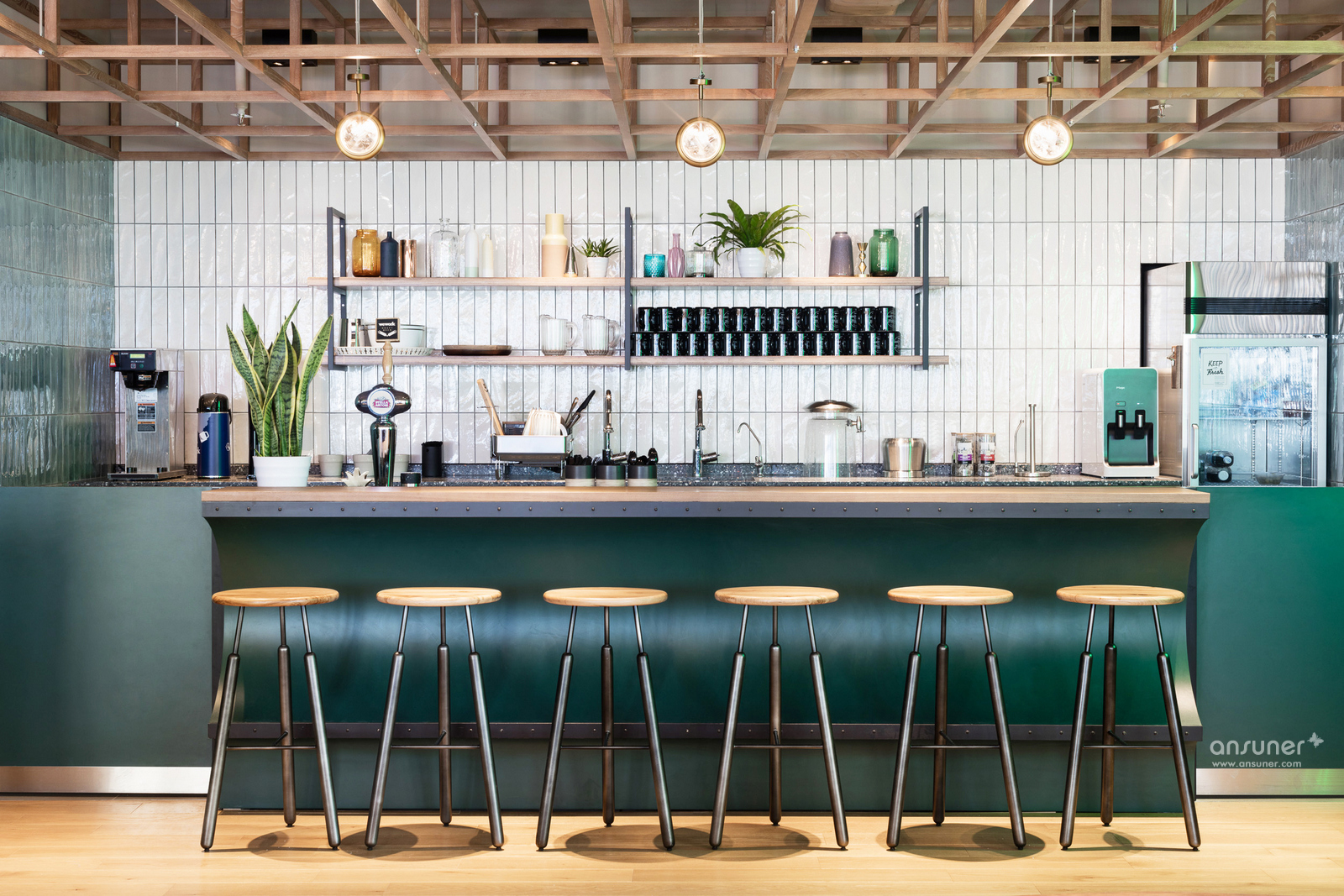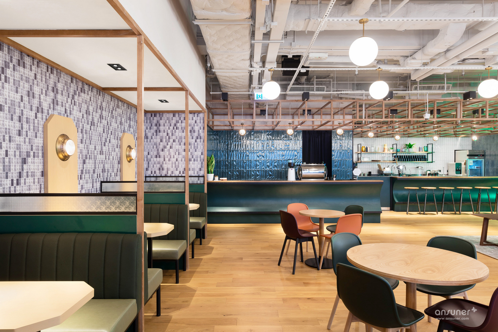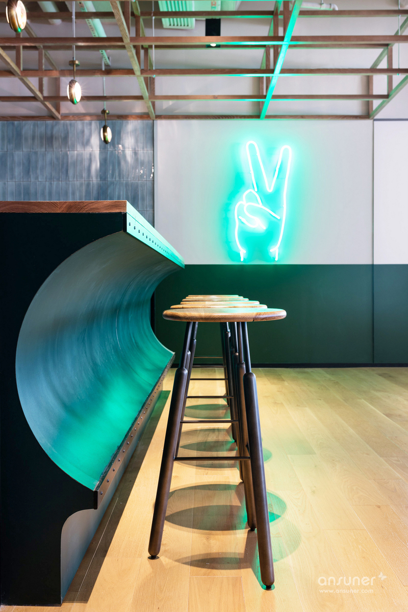 每个公共空间都设置了一个具有前瞻性和怀旧感的当地文化主题,将香港这座城市标志性的街景揉入其中。比如厨房的灵感来自传统的街边小摊;曲面造型吧台的灵感源自香港的渡轮码头;定制的沙发是向香港著名的天星轮致敬;特别设计的灯具唤起熟悉的城市影像记忆。
