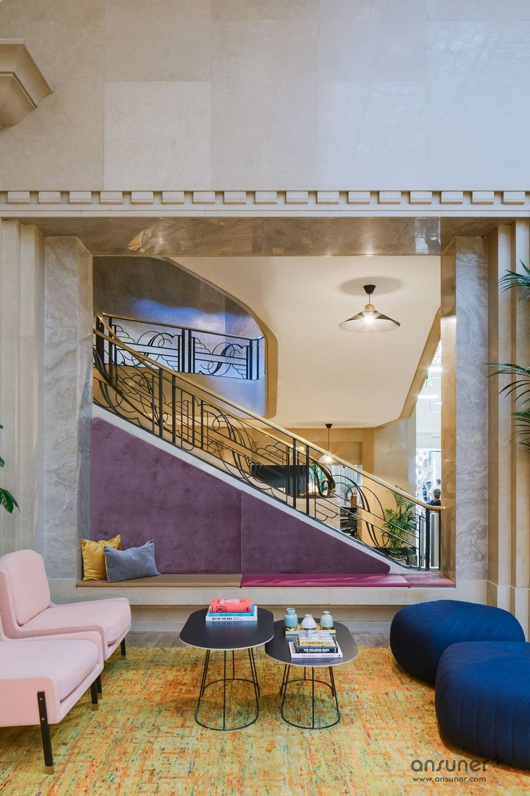 恢宏、华丽又明亮的玻璃穹顶带来令人震撼的空间视觉。跨越11层,新的办公空间保留了20 世纪 20 年代的经典装饰图形,在丰富的金属色和奢华的纺织面料衬托下,彰显出强烈的Art Deco装饰主义风格。在向这个城市的历史致敬的同时,又赋予其现代化的精髓。