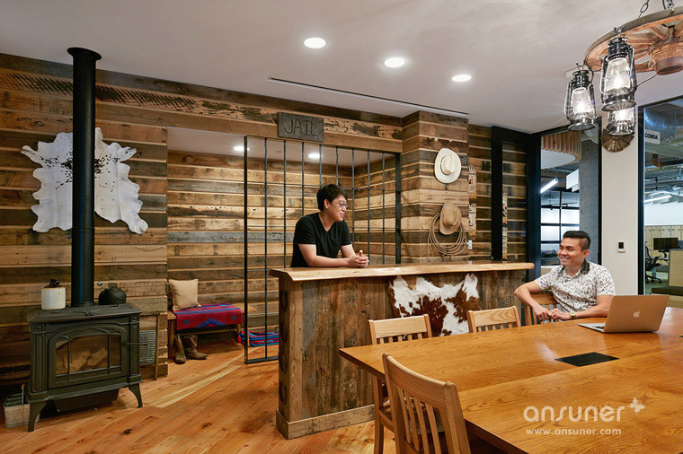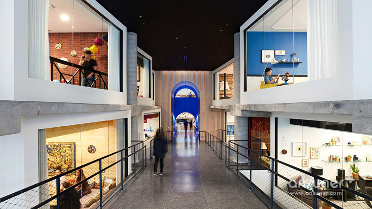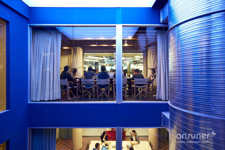 他们将既有的建筑外皮拆除,除去所有会影响玻璃砖曲面的非结构性元素;内部设计了大型的回旋楼梯环绕着中庭,通透的天光从中央撒下,刷亮了室内白墙与抛光的混凝土地板。四层楼的建筑,每层皆装饰以不同的城市、颜色、图腾和材质的元素主题,分别来自阿根廷布宜诺斯艾利斯、日本京都、印度斋浦尔和荷兰阿姆斯特丹等四个城市,与 Airbnb融入世界各地,包容多元文化的特性相呼应。各楼层的会议空间,则以各地的 Airbnb 房源为灵感,比如其中一间房呈现英式城堡的面貌,搭配绿色、红色的簇饰沙发和维多利亚风格窗;另一间则来自 1880 年美国蒙大拿州的监狱为概念,装饰以燃木壁炉、吊灯与动物皮毛等物件,充满独特风格。工作场域则被切割成 16 个风格迥异的邻里空间,每个空间都设有会议室、电话间还有大张的共同工作长桌,而其中一个名为「The Castle」的空间将地板相连接,以松木板覆盖;顶楼「The Boat」,设有象是舒服巢穴般的办公室,为工作提供更多隐蔽性,其余还有瑜珈空间、个人储物区和健康中心等空间。