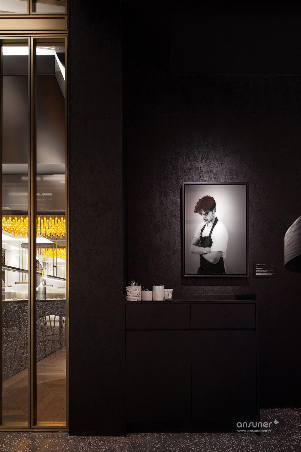 也正是在此时此刻,协调亚洲所设计的另一个设计亮点才得以真正突显出来:从门框到灯具的金色黄铜装饰,衬托出暖融,慵懒与奢华的气氛。伴随着现代感的音乐旋律,装饰镜面放大的室内效果,餐厅从内而外散发出诱人的光芒,吸引着顾客进入这个空间来。
