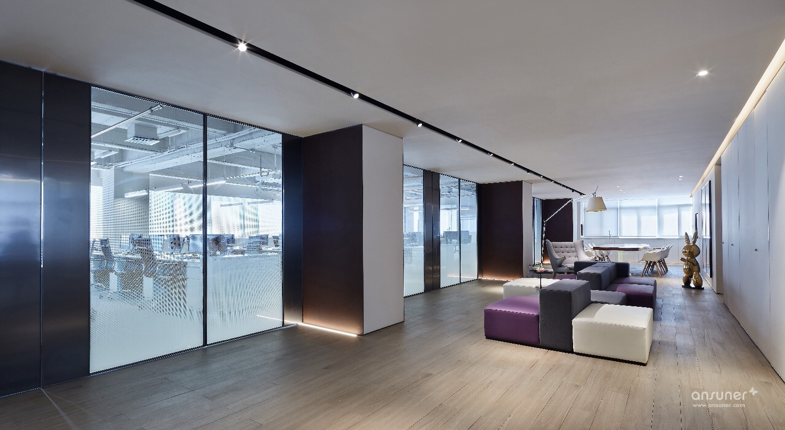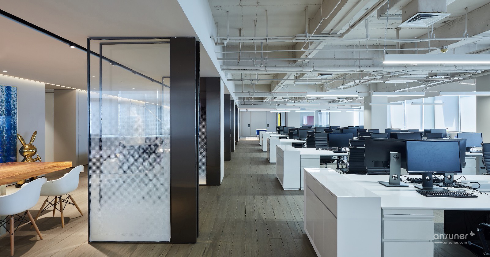 飞视设计之家这种办公组合形式给我们带来了一种开放式的空间体验:在这空间中,室内空间的划分十分灵活,通过火狐官方网站的组织,形成不同的分区,传统的门厅、走廊、办公室布局已经不复存在,取而代之的,是一个完全开敞式的流动空间。水吧区提供着办公空间基本的管理和服务;大讨论桌除了提供休闲之外,还可以作为共享的会议区使用;休闲区则有着更多的开阔性,除了阅读、休闲还适合两三人的小组工作和讨论;如果你不想被来往的人们所干扰,则可以一头埋进工作站中专注手头的工作……总之,火狐HUOHU(中国)将灵动开敞的空间使用方式代入到了该办公空间中:你可以在这里任意选择最需要的使用空间。