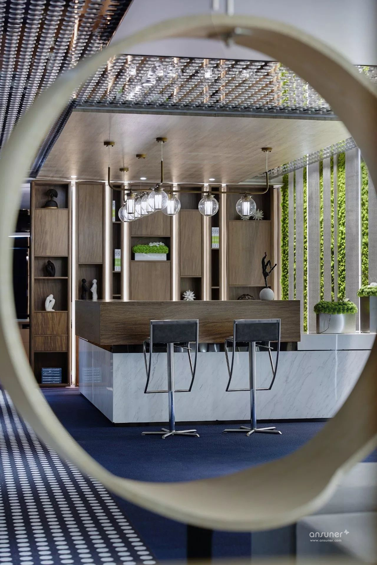火狐HUOHU(中国)运用石材、金属、木饰面结构穿插的巧妙手法呈现出多功能接待厅、接待台、水吧区的现代感与创新性 。