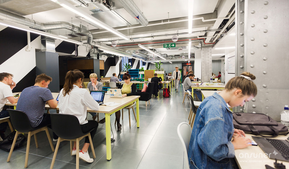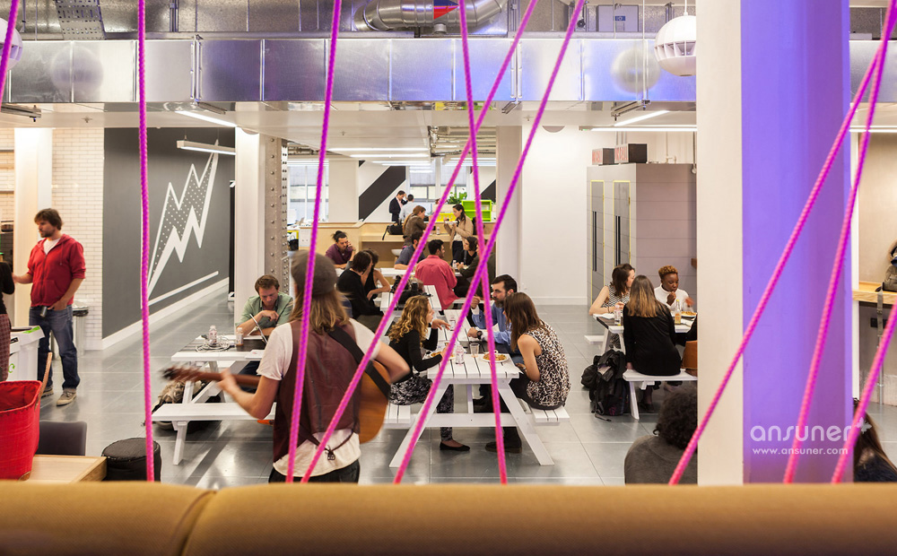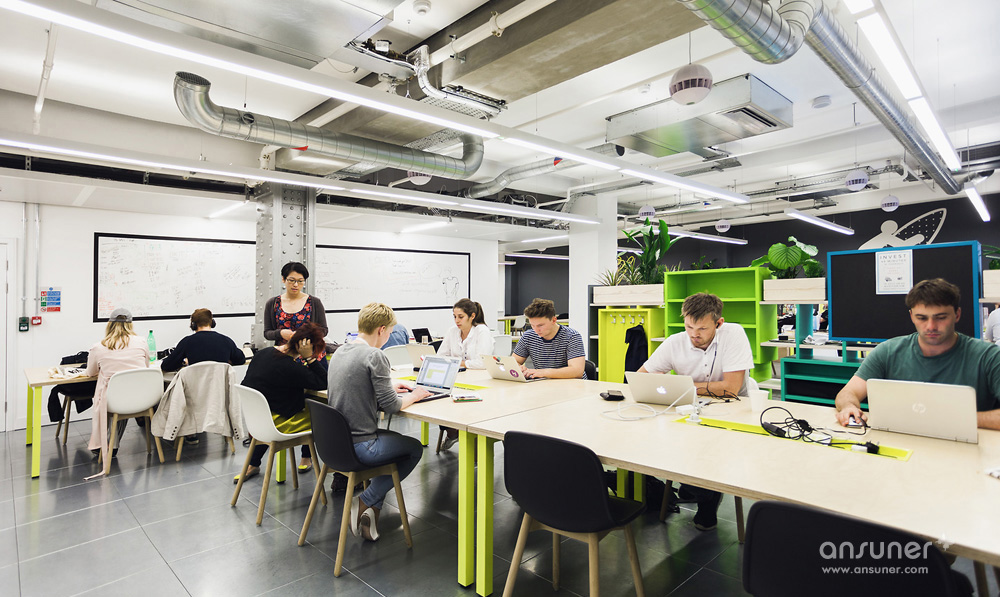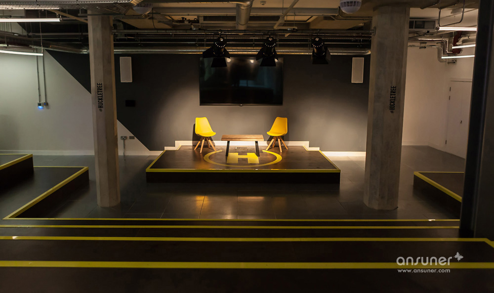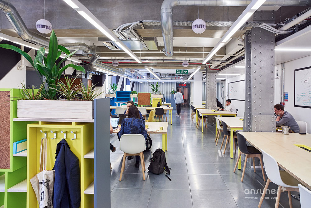▼“空中课堂”,讲座和演示的地方,这里有着雕塑般的吸音吊顶设计;共享空间 伦敦Huckletree联合办公设计欣赏