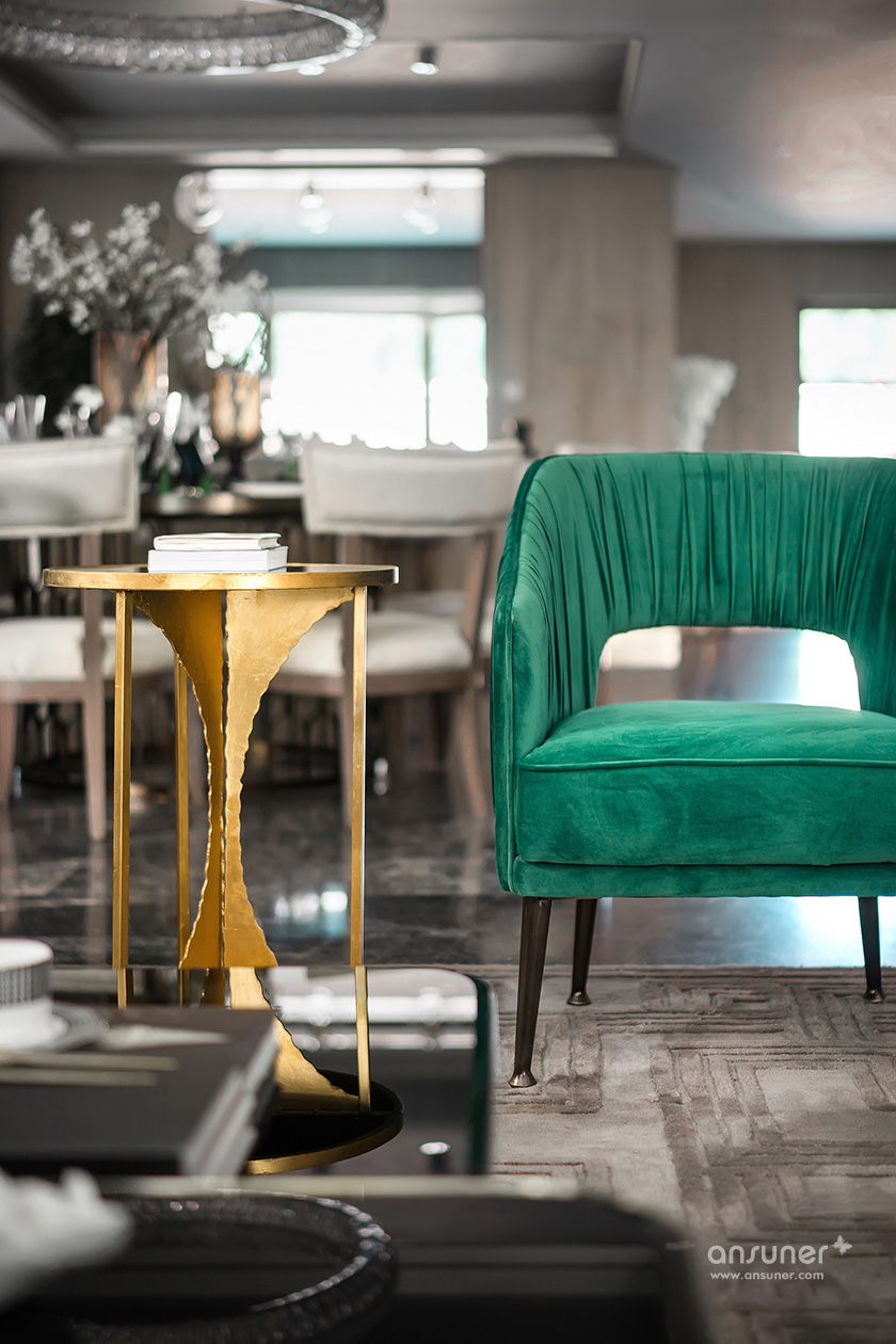 客厅与餐厅的设计中,高贵的气质在祖母绿与高级灰结合的刹那占领整个空间,在温润如玉的质感与盈透的色泽中,彰显着无与伦比的诱惑魅力。 她说:我想要让身处其间的人,在妙曼的视觉感受之后,发现有某些元素能够触碰我们内心的原点。