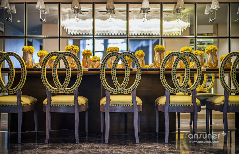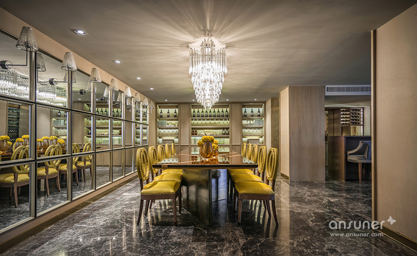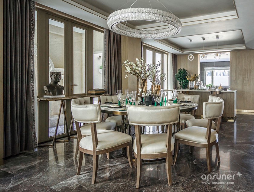 在聚餐厅,你可见独具风情的铆钉元素餐椅,来自欧洲的复古火狐官方网站,宛若白流苏一般的水晶吊灯,图案独特的地毯与精美的花艺,交叠出艺术的格调。