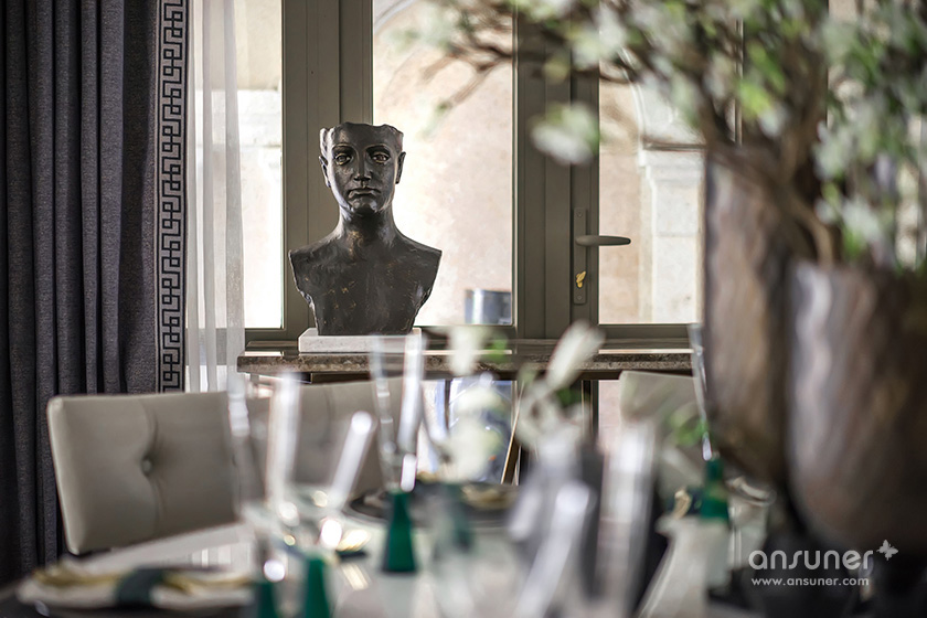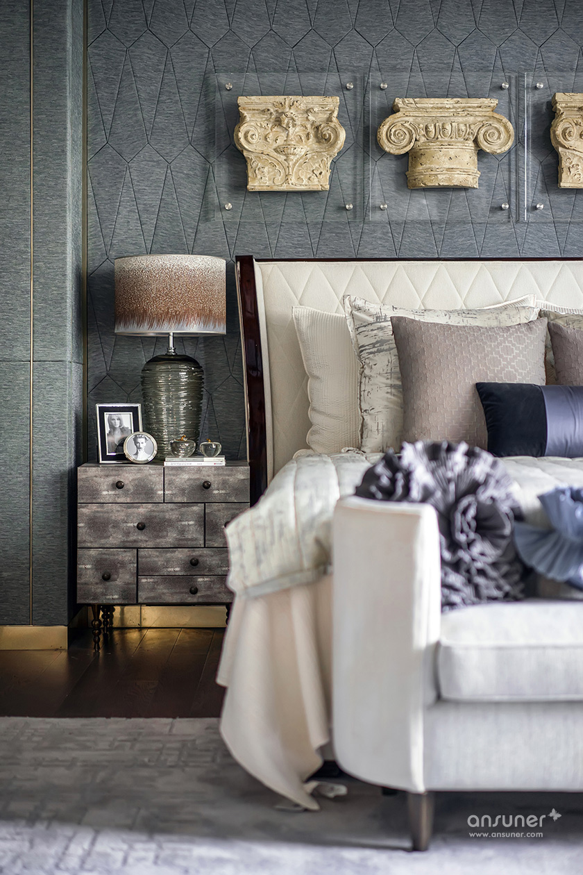主卧的设计中,火狐HUOHU(中国)将古旧粗犷的古罗马建筑元素提炼成了床头的艺术装置,用精巧的方式将宏大的叙事载入空间,克制的色系与浪漫的表达形成了东方和西方的对话。
