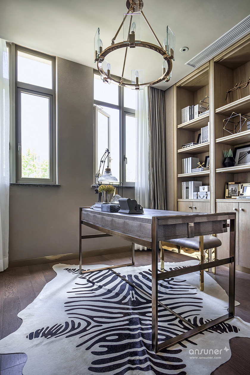 书房中,简练的色调,奔放的斑马纹地毯与精致的皮艺形成视觉上的张力,凸显经典与现代的交织感。
