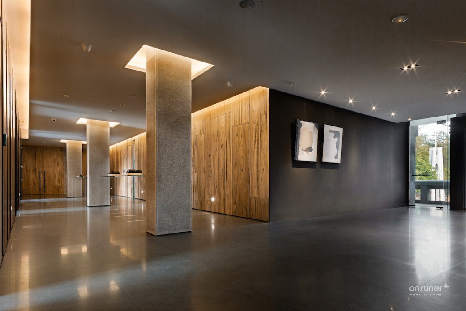 低调的材料:象征质朴刻意抛磨粗犷的石材,富有人文气息书法线条般的木皮,沿用外墙柱面46年历史的斩石子。 简约沈稳原始的素材 烘托下,空间的延伸,时间的延续,新的生命传承!