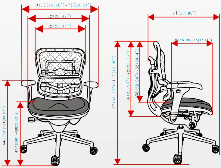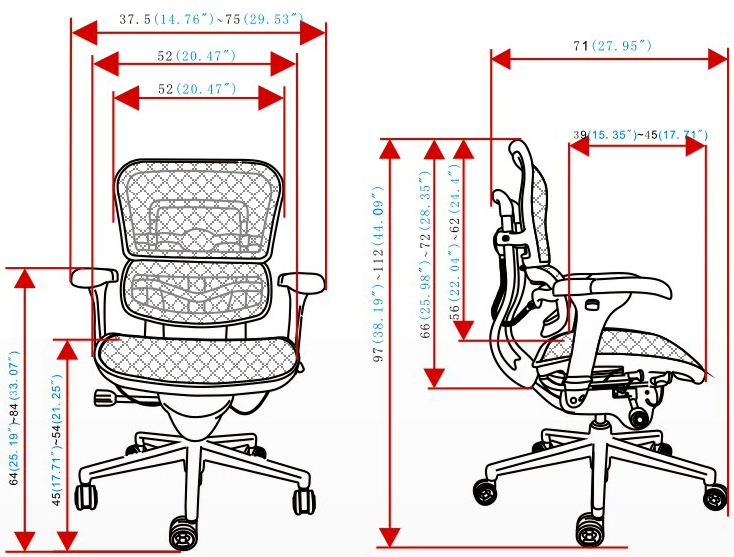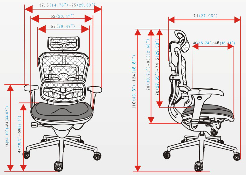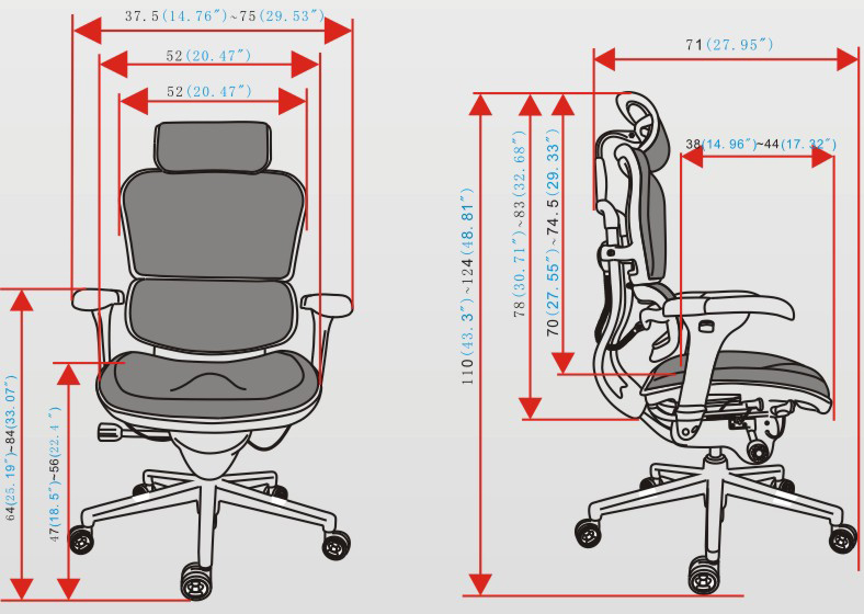 头枕、背垫、腰枕及座垫均为进口网布;黑色塑胶框架,PU扶手垫;塑胶头枕插条、头枕横把手;背支撑架、底盘支撑架均为铝合金精抛光;100MM气压棒,340MM铝合金精抛光椅脚,60MM PU滑轮;