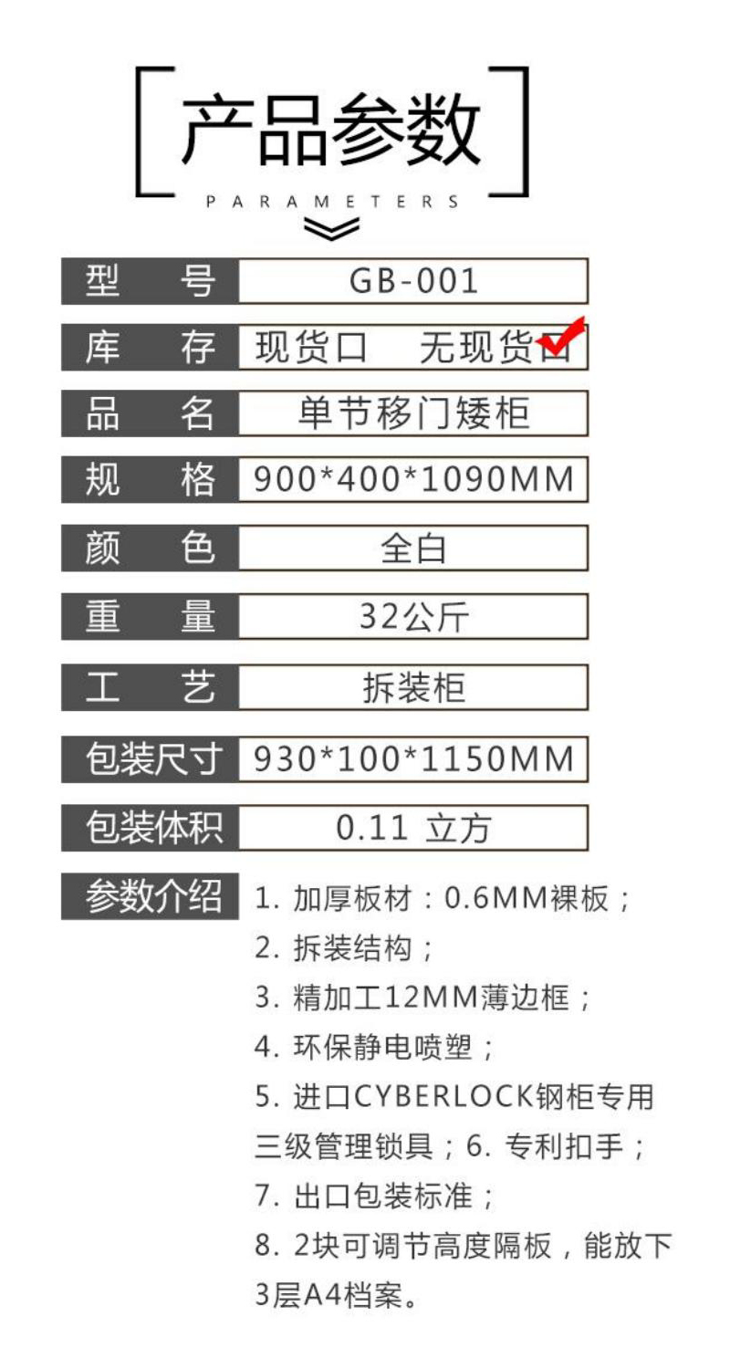 1加厚板材:0.6MM裸板 2.拆装结构; 3精加工12MM薄边框 4.环保静电喷塑; 5进口CYBERLOCK钢柜专用 三级管理锁具;6.专利扣手; 7.出口包装标准; 8.2块可调节高度隔板,能放下3层A4档案