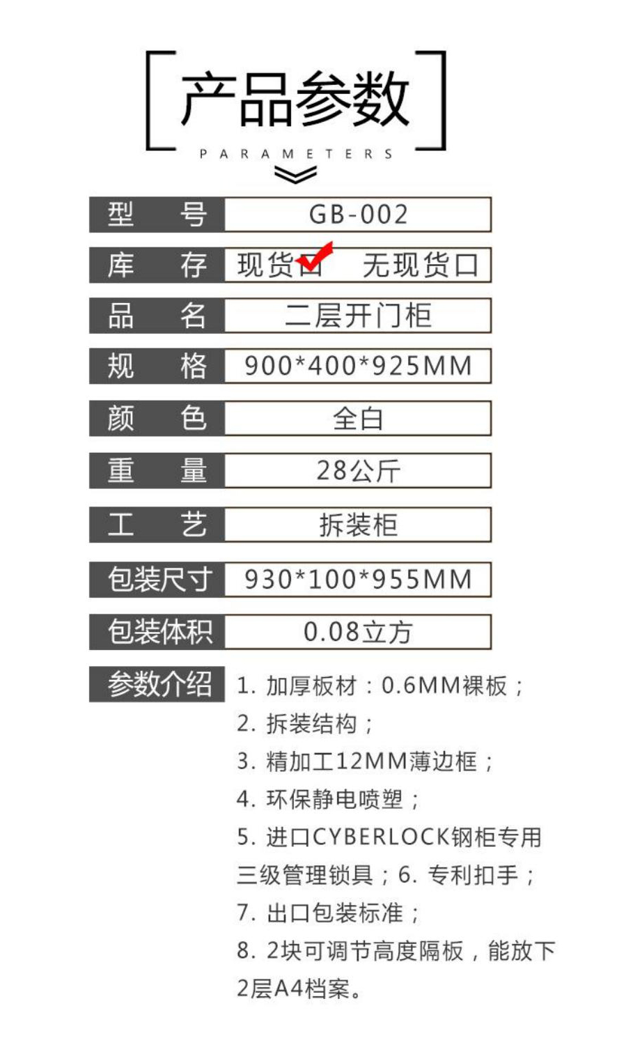 1.加厚板材:0.6MM裸板 2.拆装结构; 3精加工12MM薄边框; 4.环保静电喷塑; 5进口CYBERLOCK钢柜专用 三级管理锁具;6.专利扣手; 7.出口包装标准; 8.2块可调节高度隔板,能放下2层A4档案