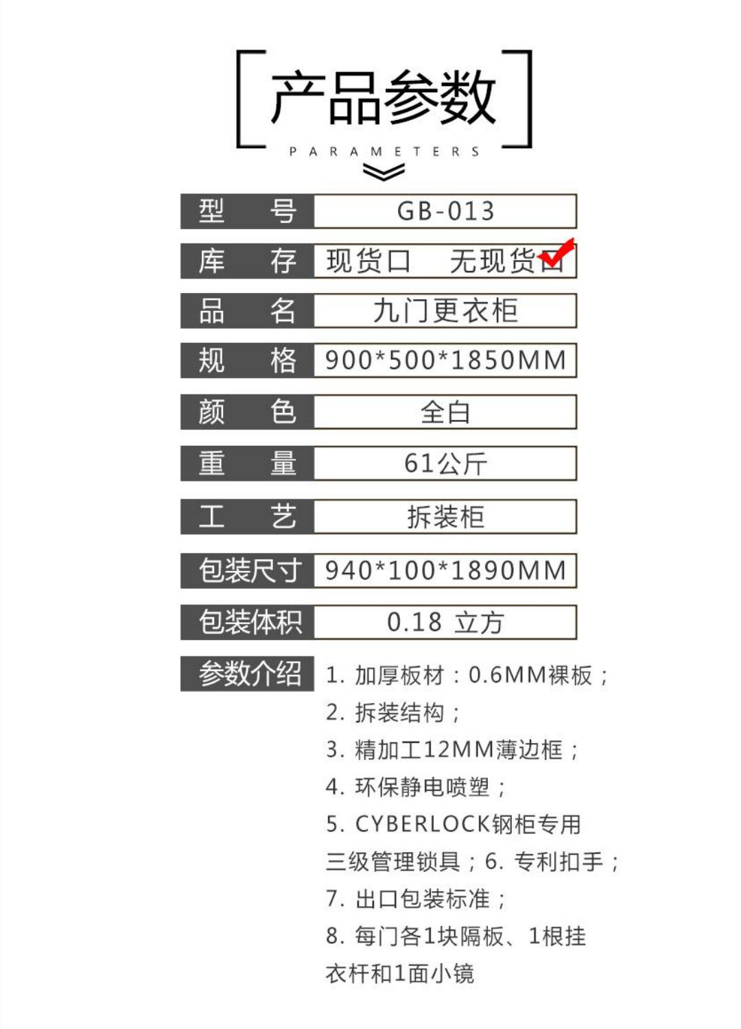 1.加厚板材:0.6MM裸板; 2.拆装结构; 3.精加工12MM薄边框; 4.环保静电喷塑: 5.CYBERLOCK钢柜专用三级管理锁具;6.专利扣手; 7.出口包装标准; 8.每门各1块隔板、1根挂衣杆和1面小镜.