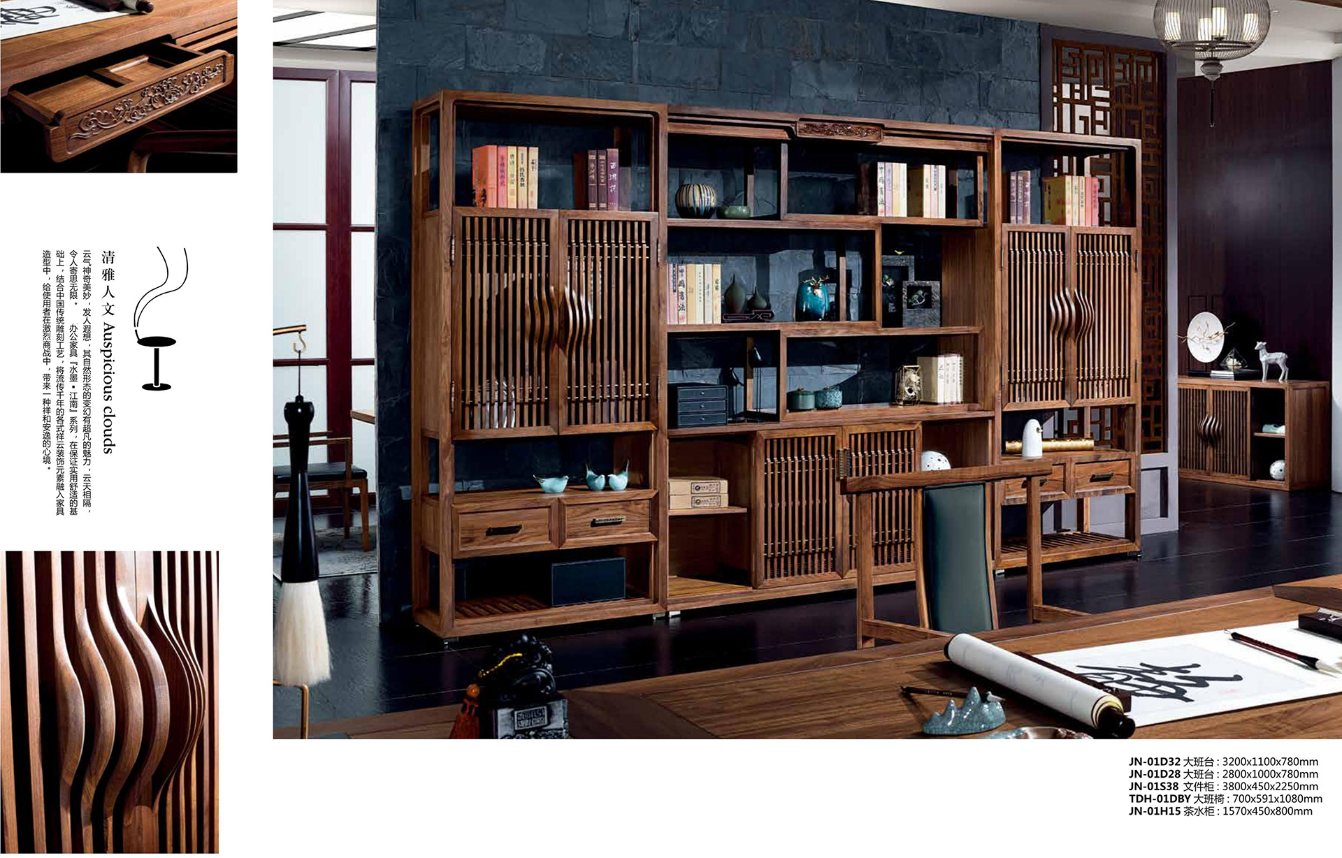 云气神奇美妙“发人遐想 其自然形态的变幻有超凡的魅力“云天相隔,令人寄思无限“办公火狐官方网站【水墨·江南】系列“在保证实用舒适的基础上“结合中国传统雕刻工艺 将流传千年的各式样云装饰元素融入火狐官方网站造型中·给使用者在激烈商战中·带来一种祥和安逸的心境。