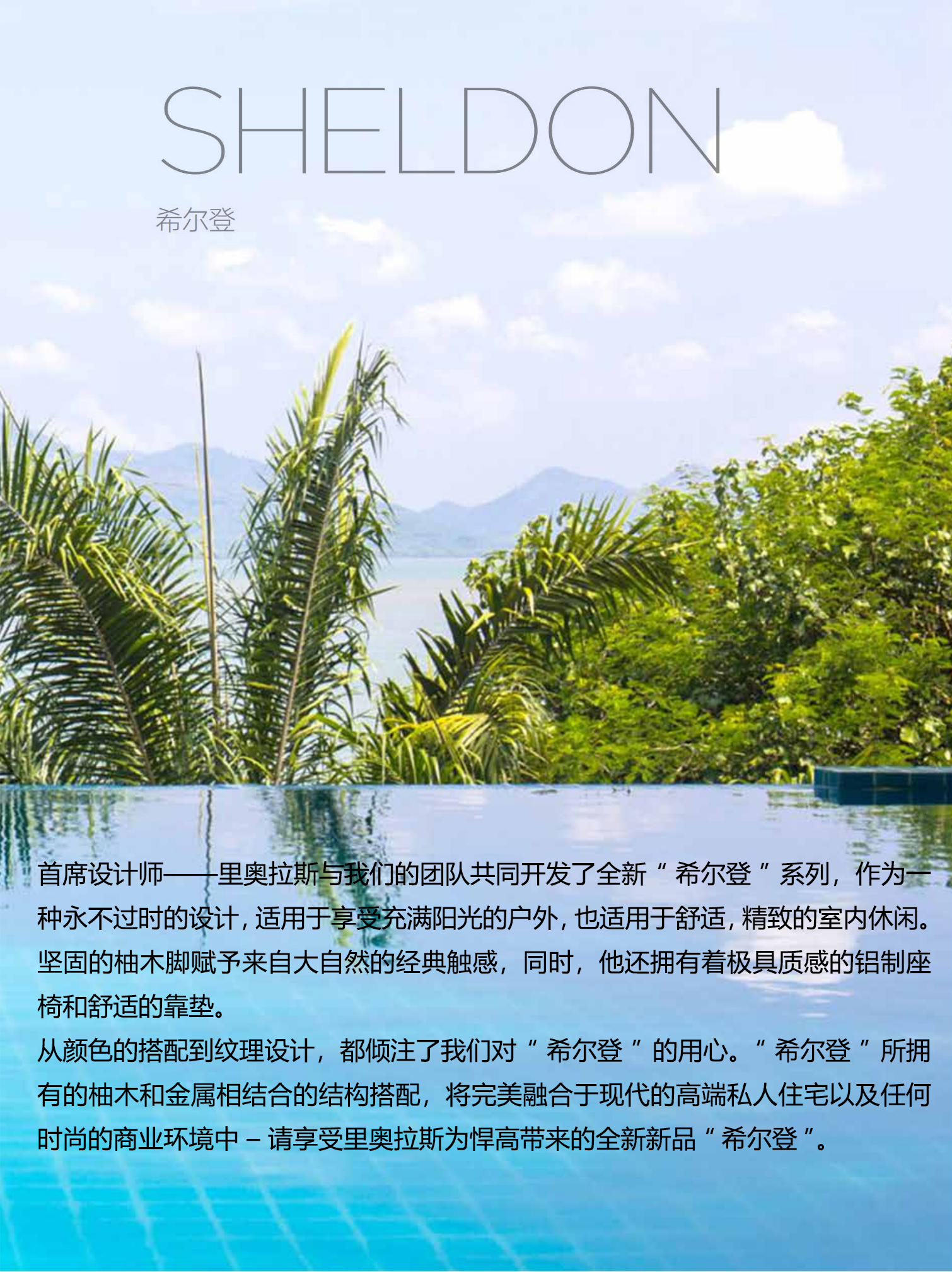 首席火狐HUOHU(中国)——里奥拉斯与我们的团队共同开发了全新“希尔登”系列,作为一种永不过时的设计,适用于享受充满阳光的户外,也适用于舒适,精致的室内休闲。坚固的柚木脚赋予来自大自然的经典触感,同时,他还拥有着极具质感的铝制座椅和舒适的靠垫。 从颜色的搭配到纹理设计,都倾注了我们对“希尔登”的用心。“希尔登”所拥有的柚木和金属相结合的结构搭配,将完美融合于现代的高端私人住宅以及任何时尚的商业环境中 – 请享受里奥拉斯为悍高带来的全新新品“希尔登”。 “经久”---极具质感的实心金属板和A级缅甸进口柚木的巧妙搭配,经典的选材初衷 “精致”---一体式铝板,纯粹而不单调,坚固的柚木脚赋予来自大自然的经典触感,彰显低调的奢华 “便捷”---产品整体无需组装,拆箱即可使用;进口陶瓷玻璃耐脏且极易清洁